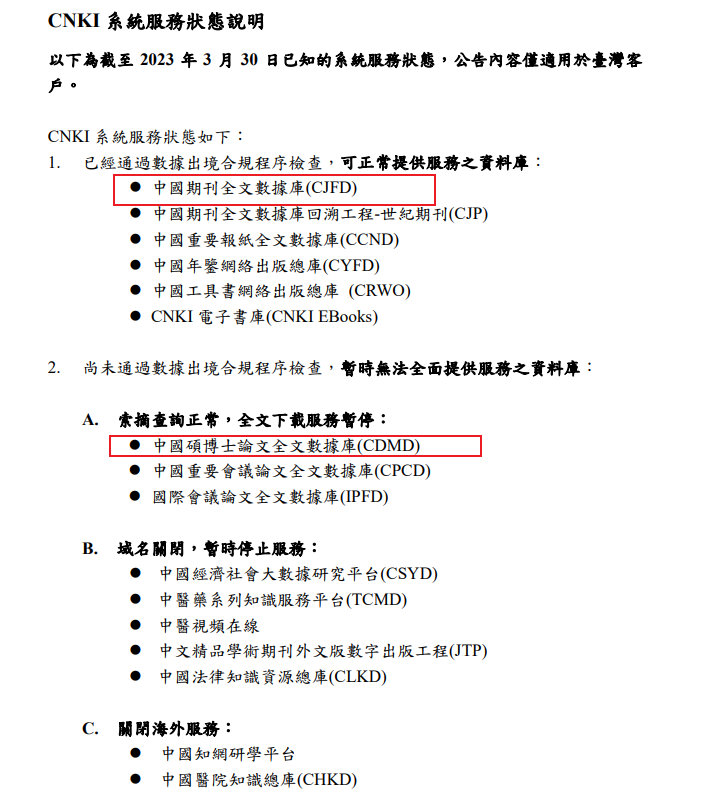 因收到CNKI中國知網通知,中國知網將于2023年4月1日起暫停【中國優秀碩士學位論文全文數據庫】以及【中國博士學位論文全文數據庫】等產品的服務,恢復時間將另行通知。 中國期刊全文資料庫(CJFD)則仍可正常使用。 造成不便,特此致歉。