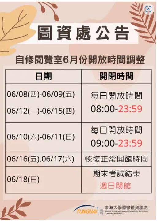配合期末考到來,今天(6/8)開始圖書館及自修閱覽室開放時間調整如下,祝各位同學考試順利。