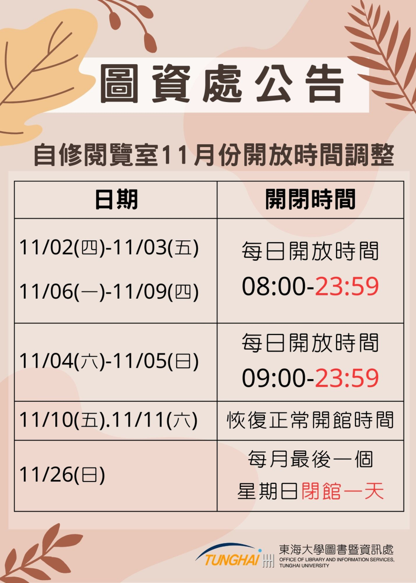 自修閱覽室11月份開閉館時間公告