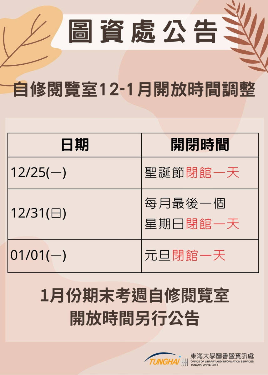 自修閱覽室12月-1月閉館公告