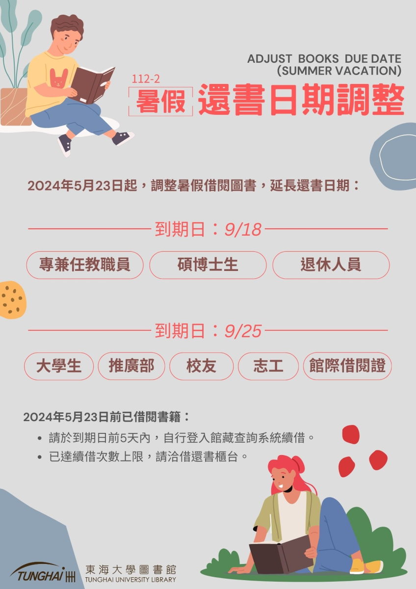 2024年5月23日起,調整暑假借閱圖書,延長還書日期: