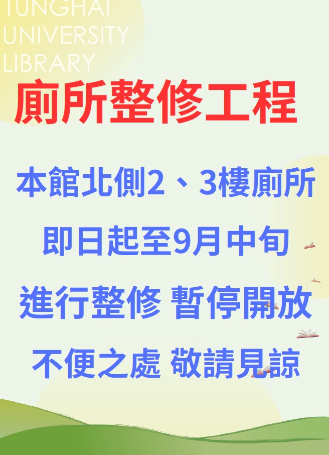 本館即日起至九月中旬北側2-3樓廁所施工,暫停開放;1-2樓廁所受施工影響,亦暫停開放。