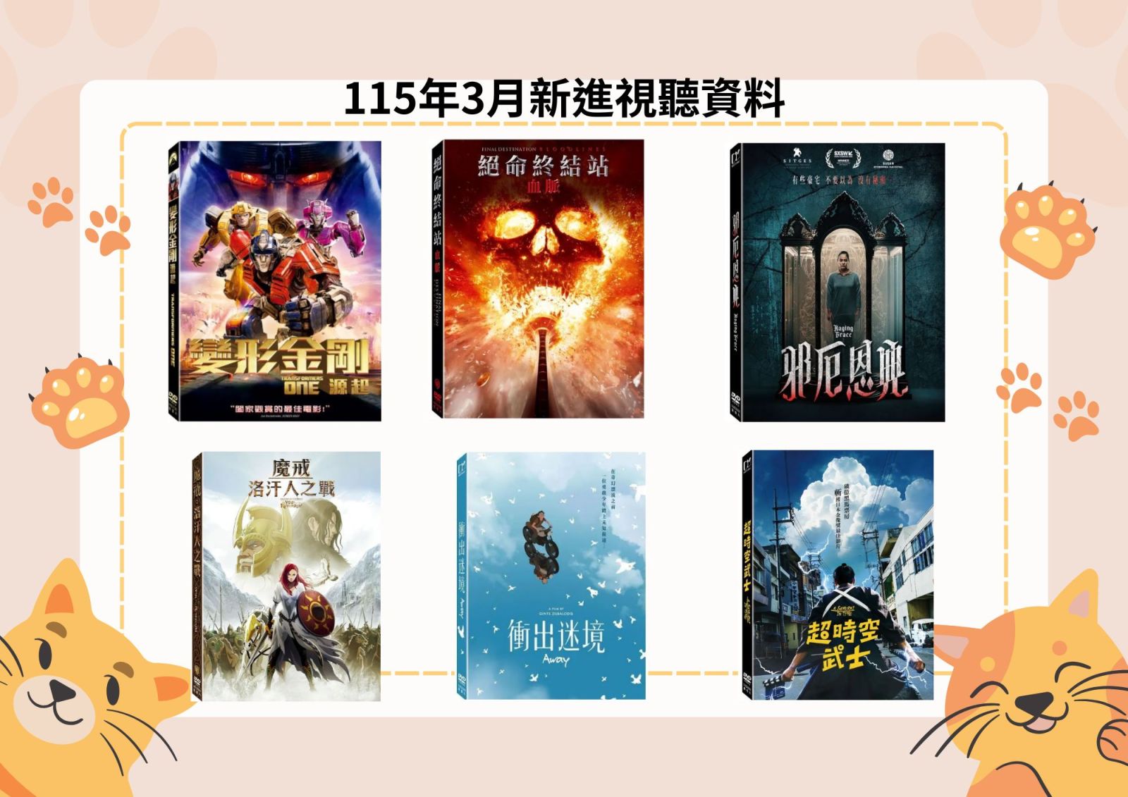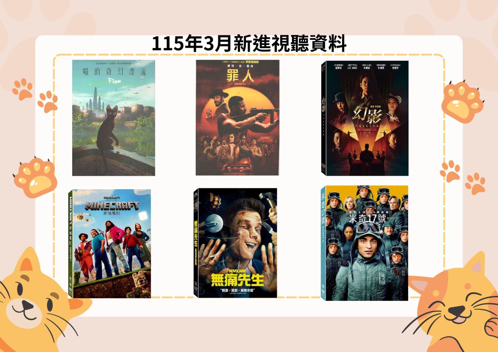 本次新進影片《喵的奇幻漂流》(Flow)榮獲奧斯卡金像獎最佳動畫長片,《罪人》(Sinners)亦入圍奧斯卡金像獎多達16項提名,歡迎至圖書館3樓多媒體室借閱觀賞。