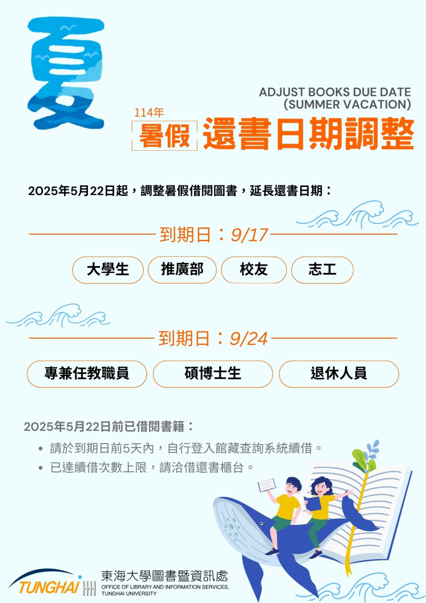 2025年5月22日起,調整暑假借閱圖書,延長還書日期: