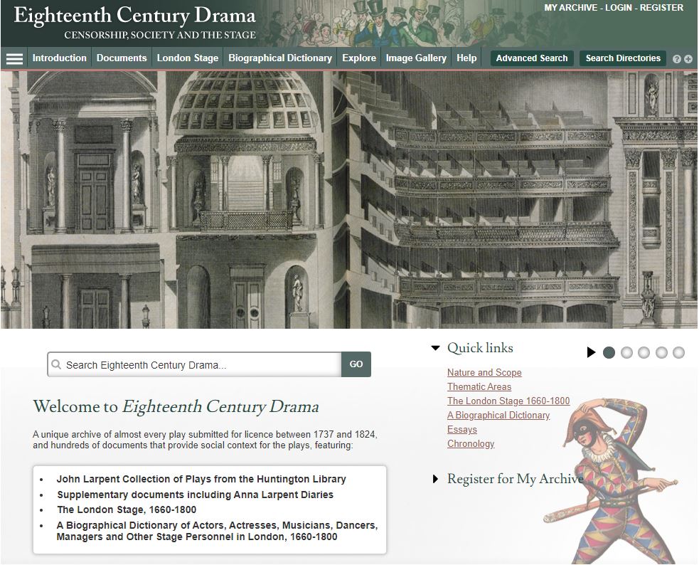 十八世紀戲劇資料庫主要涵蓋三種資源:約翰.拉彭特戲劇收藏和安娜.拉彭特日記、倫敦舞台數據庫、傳記詞典數據庫。