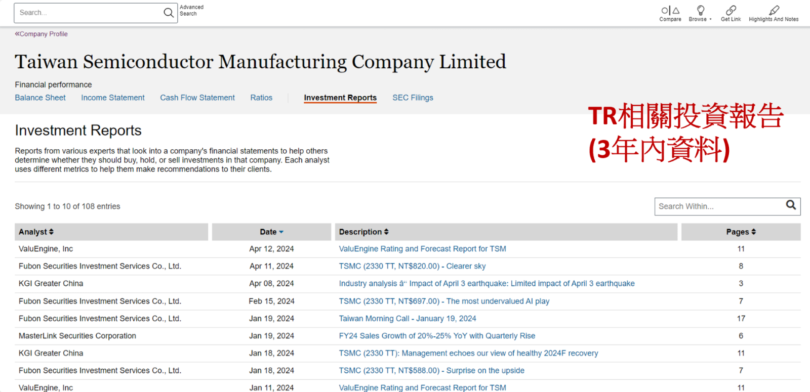 1. 收錄Thomson Reuters / Reuters Research On Demand的投資 / 財務報告。