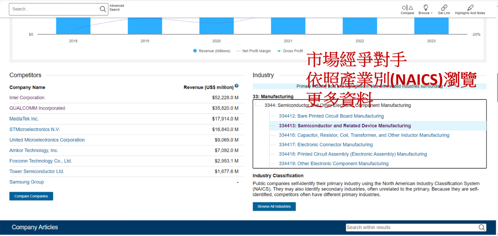 2. 收錄商管所需的研究報告,例如SWOT報告、公司歷史、市場份額排名、公司年度排名、公司檔案等。(請參閱下表示意圖)