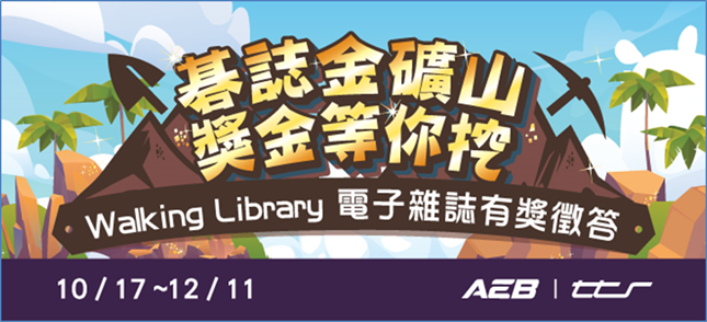 為引發讀者對電子雜誌的興趣,以及培養讀者使用電子雜誌的習慣,我們策劃此次有獎徵答活動,期望讀者在活動中,能夠感受到電子雜誌的便利,並飽覽其中豐富、無疆界的知識。誠摯邀請教職員生,一同參與【碁誌金礦山,獎金等你挖】有獎徵答活動。