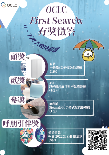 為鼓勵師生充分利用CONCERT已購OCLC FirstSearch全國版資料庫,特此舉辦 【O~下雨下到快發霉 FirstSearch 有獎徵答】活動,本活動幫助師生充分瞭解並利用優質的電子資源,有益於教學和研究發展。歡迎全校師生一起共襄盛舉,參加答題抽大獎!
