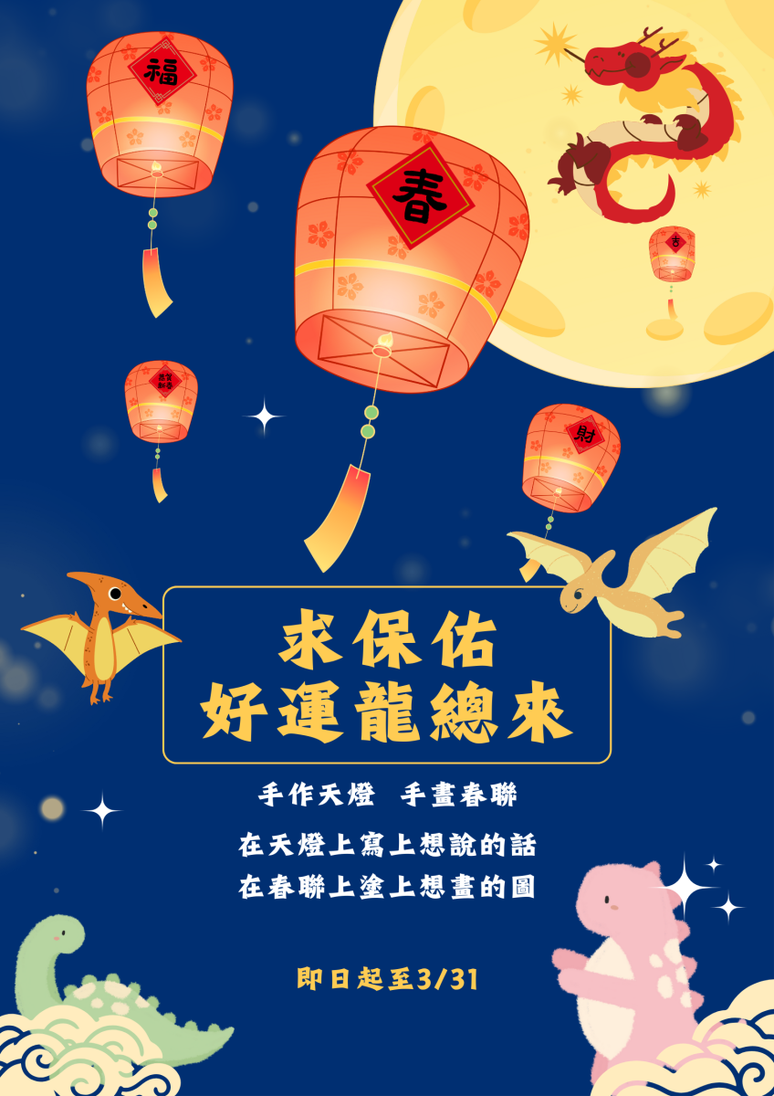 1. 手作小天燈或春聯上寫上想要說的話或圖,完成後將掛在圖書館裡面供大家欣賞。