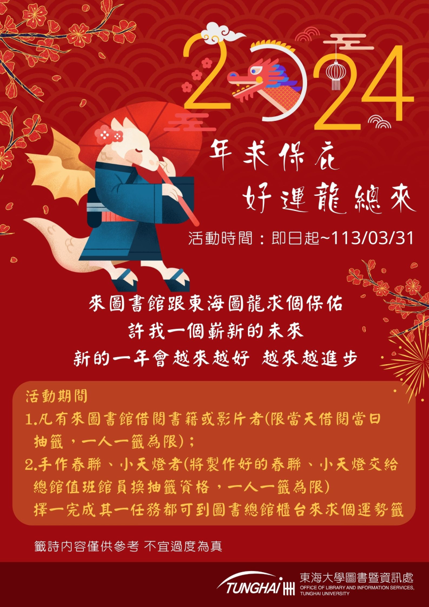 圖書總館為了迎接龍年元宵節,舉辦「2024年求保庇 好運龍總來」活動,來圖書館跟東海圖龍求個保佑,許一個嶄新的未來,新的一年會越來越好,越來越進步!