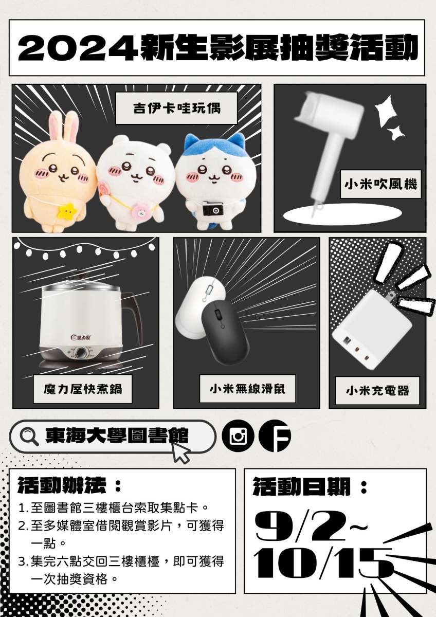 活動期間至圖書館三樓多媒體室借閱影片或在現場觀賞影片,可獲得一點,集滿六點可獲得一次抽獎機會,看越多,中獎機率就越高喔!!快煮鍋、負離子吹風機、快充充電器等你來帶走...