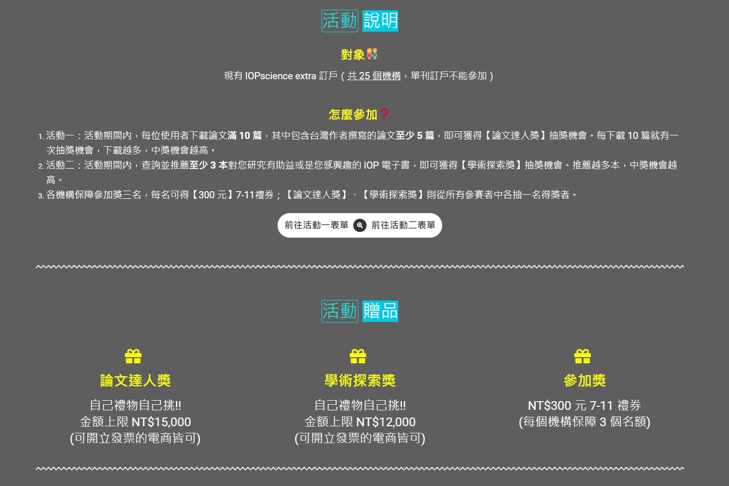 1.論文達人: 活動期間內,每位使用者下載論文滿 10 篇,其中包含台灣作者撰寫的論文至少 5 篇,即可獲得【論文達人獎】抽獎機會。