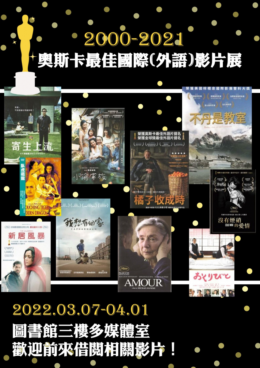 圖書館多媒體室整理了2000年至今的最佳國際影片獎獲獎及入圍作品,其中包括李安導演在2000年得獎的《臥虎藏龍》、法國電影《放牛班的春天》、在奇幻電影中相當經典的《羊男的迷宮》、在全球大受好評的《寄生上流》等等。除此之外更有許多你或許聽過、又或許陌生的好作品,千萬別錯過了!快到圖書館三樓多媒體室借閱欣賞吧!片單連結 https://ithu.tw/oscar