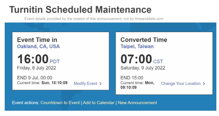 Turnitin預計將於2022/7/9(六)進行8小時的系統維護。預計台北時間