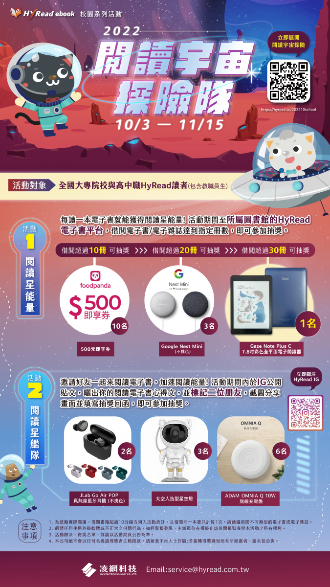 - 活動名稱:閱讀宇宙探險隊── 2022HyRead電子書校園活動