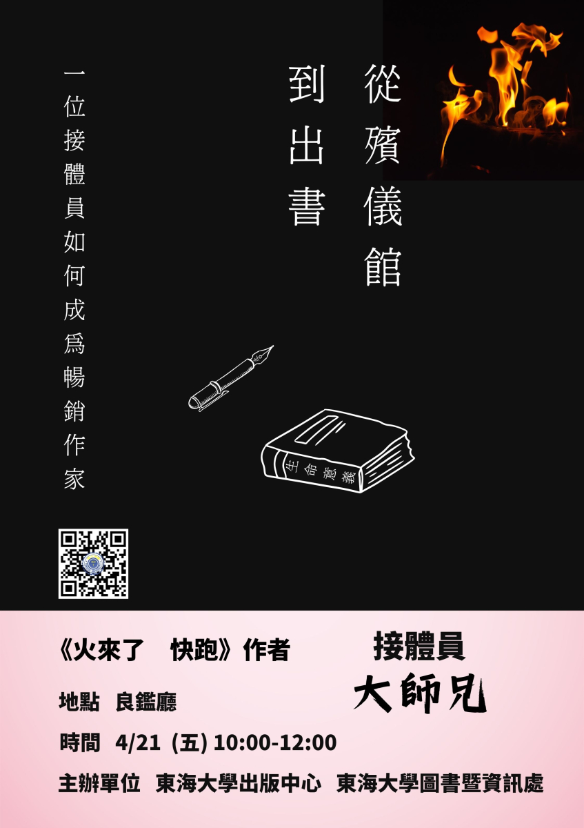 在殯儀館工作多年,從接體員到火葬場技工,而現在開始讀書,開始回學校上課,開始寫作出書,開始到處演講,努力充實自己,體驗活著的意義。 講者: 《火來了 快跑》作者 大師兄 地點: 圖書總館地下一樓 良鑑廳 時間: 4/21 (五) 10:00-12:00 報名網址:https://event.ithu.tw/2023030110 主辦單位:東海大學出版中心 東海大學圖書暨資訊處