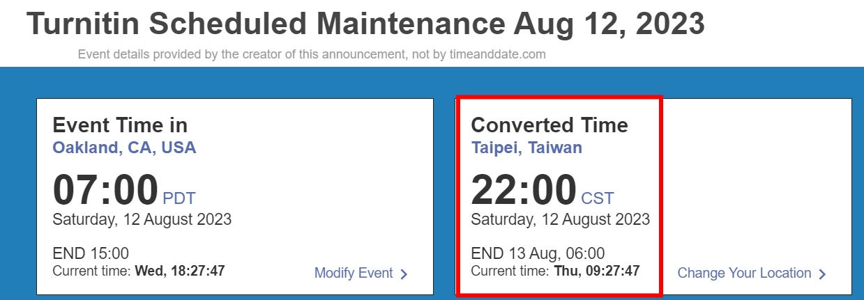 Turnitin預計將於2023/8/12(六)進行8小時的系統維護,預計於台灣時間: