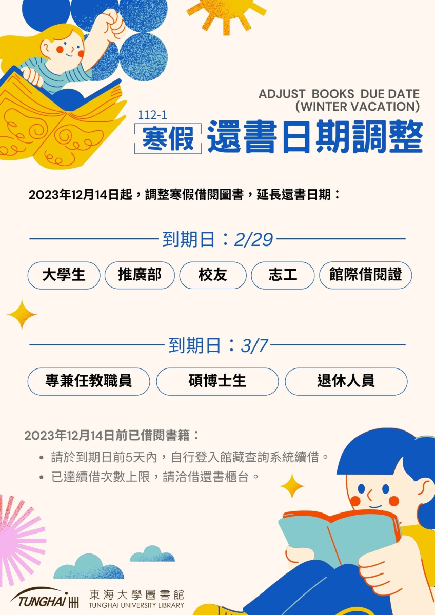 2023年12月14日起,調整寒假借閱圖書,延長還書日期: