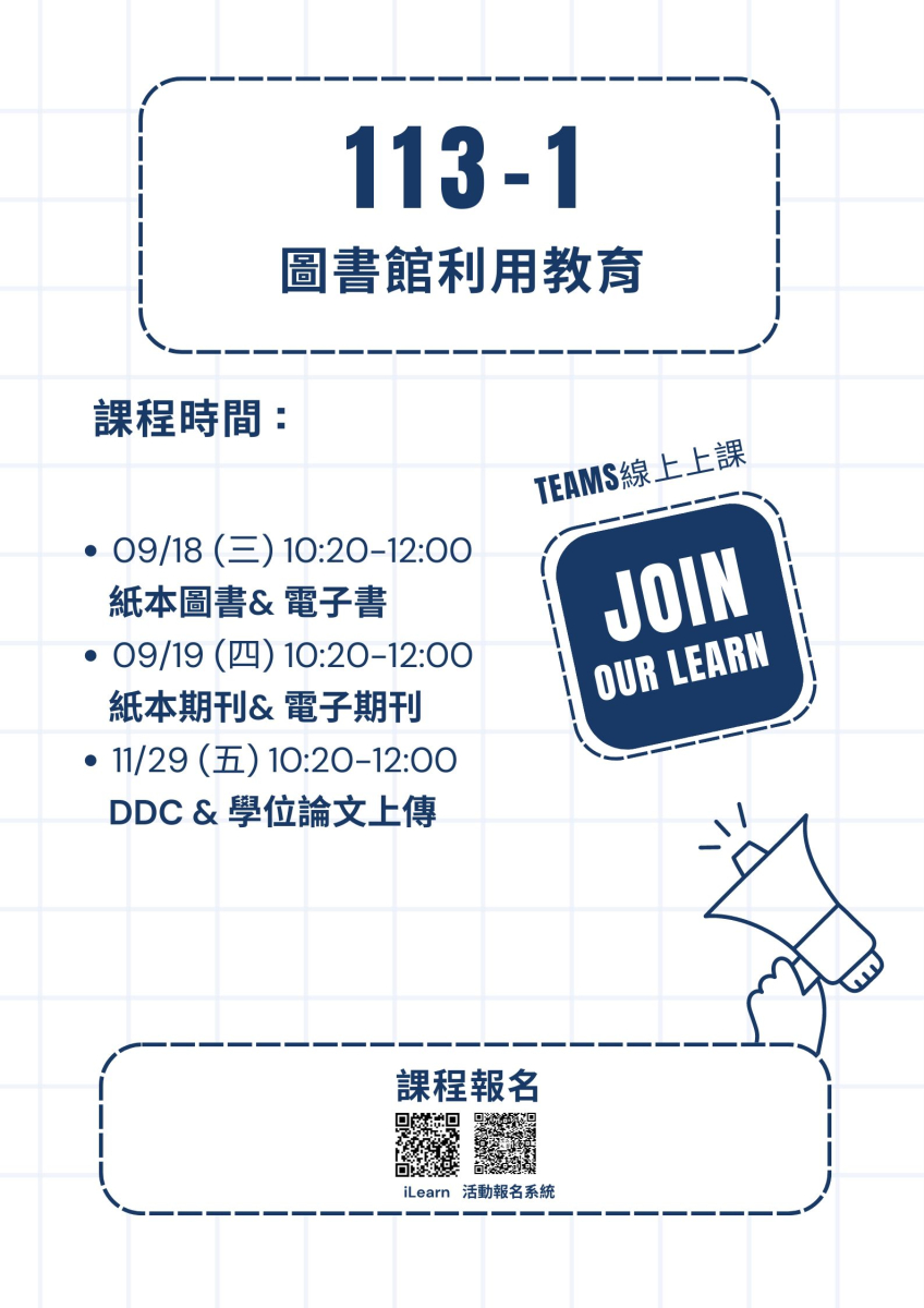 本課程使用Teams上課,報名網址 https://event.ithu.tw/2024090058 iLearn課程 https://ilearn.thu.edu.tw/course/142114/content#/ 09/18 (三) 10:20-12:00 紙本圖書& 電子書 09/19 (四) 10:20-12:00 紙本期刊& 電子期刊 11/29 (五) 10:20-12:00 DDC & 學位論文上傳