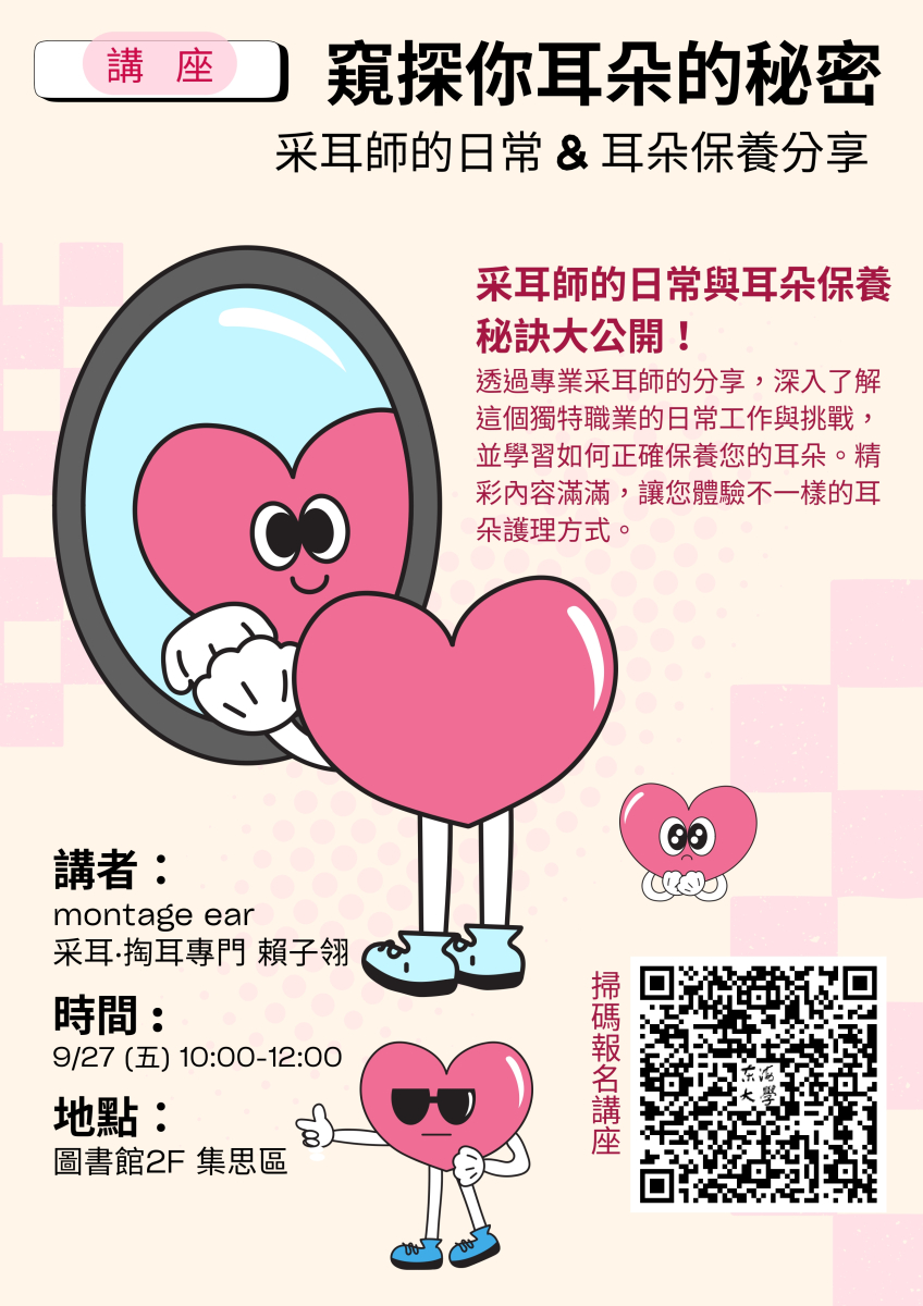 時間:9/27 (五) 10:00-12:00 講者:montage ear 采耳·掏耳專門 賴子翎 地點:圖書館2F 集思區