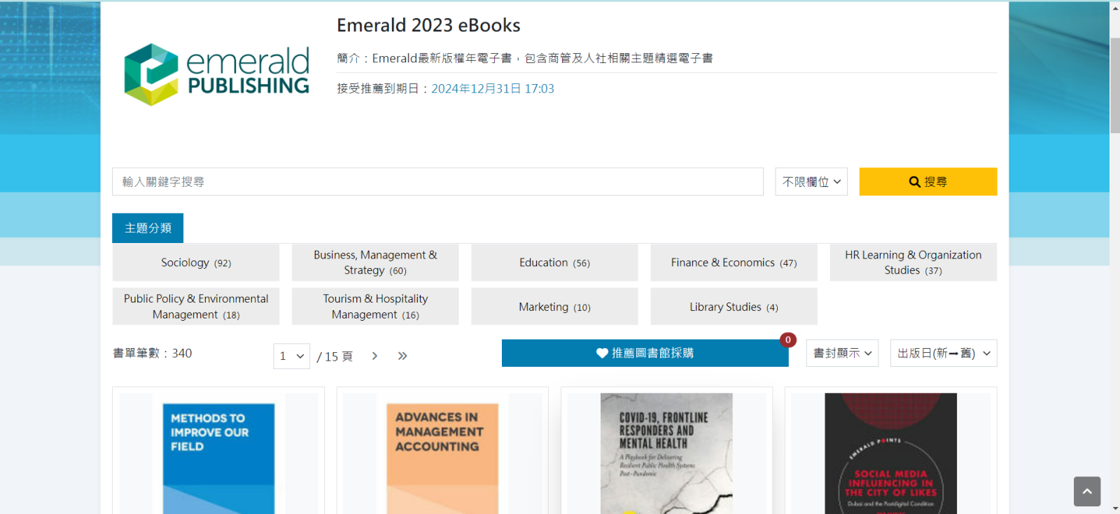 【Emerald 2023 eBooks】平台連結:目前共有340本書,包含商管及人社相關主題精選電子書。