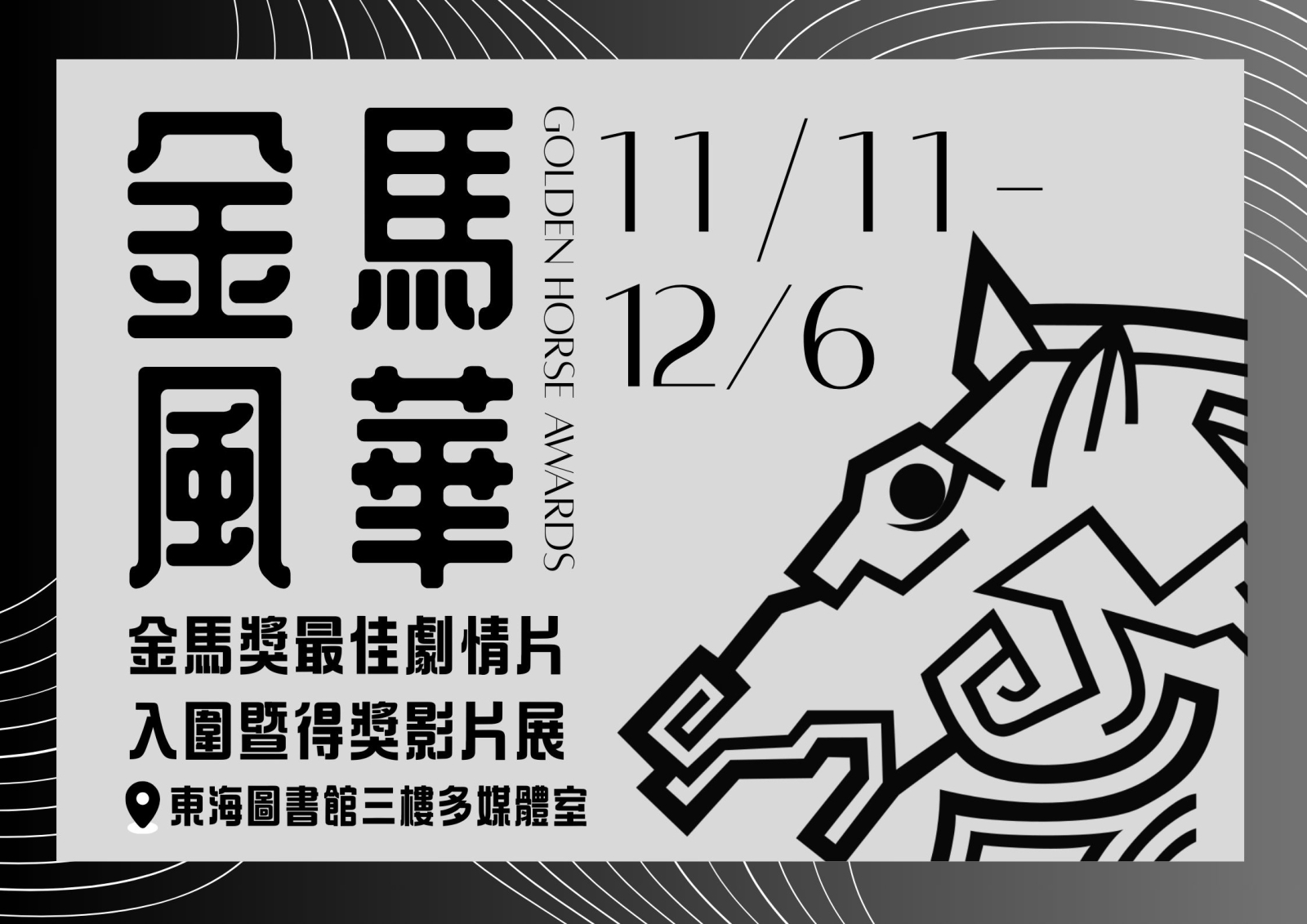 內容:第61屆金馬獎頒獎典禮將於113年11月23日在台北流行音樂中心舉行。113年11月11日起,圖書館多媒體室將展出近年金馬獎最佳劇情片入圍暨得獎影片,這些影片不僅代表華語電影的最高水準,也讓觀眾得以一窺導演與創作者的無限創意。無論是喜愛懸疑驚悚,還是偏好溫馨劇情的觀眾,都能在此找到心儀之作。歡迎跟我們一同沉浸在視覺與聽覺的饗宴中,共同見證華語電影的魅力,並期待每一位觀眾都能在這裡找到自己喜愛的電影!