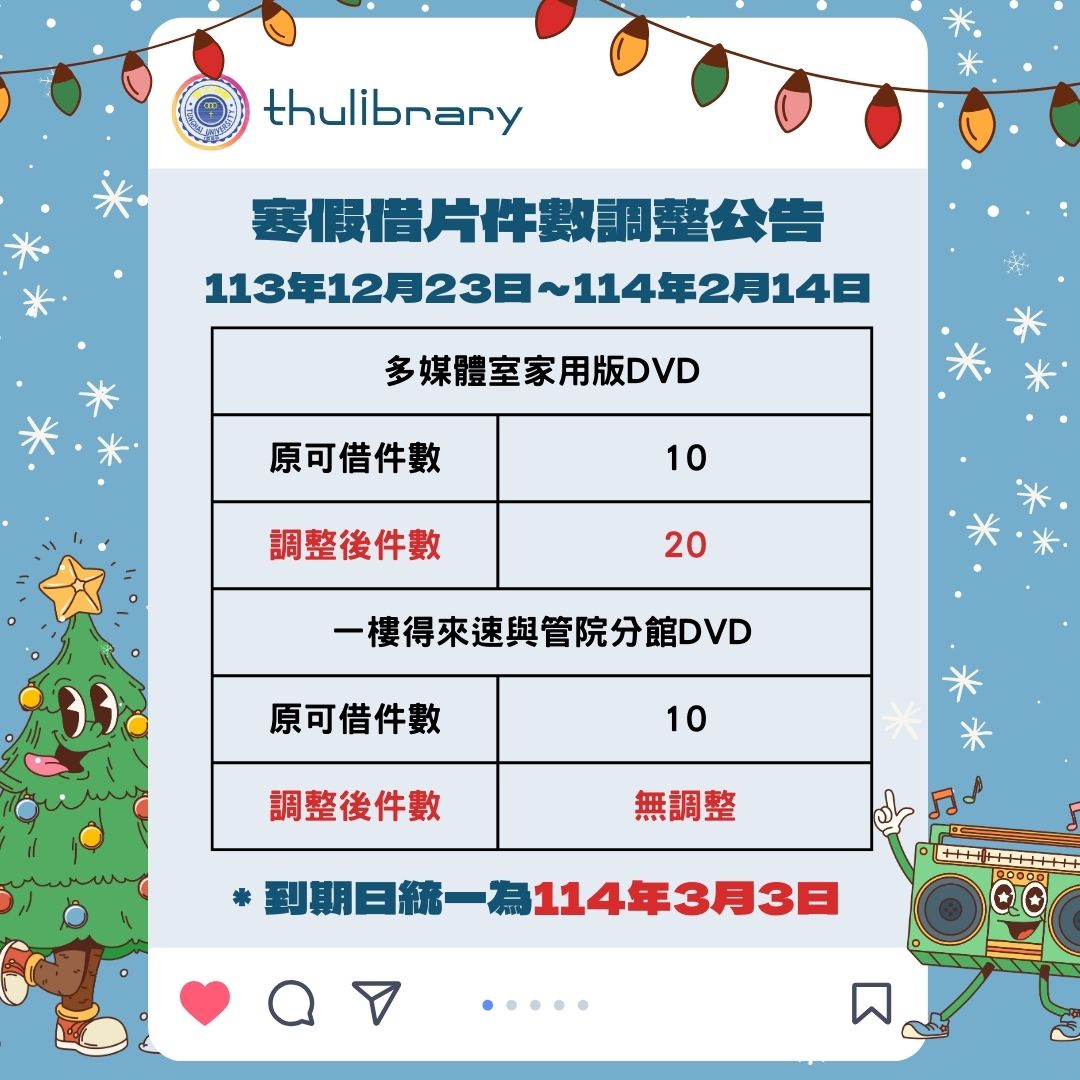 寒假即將到來,為配合寒假期間師生觀影需求,多媒體室調整家用版視聽資料借閱件數及到期日,113年12月23日至114年2月14日每人可借件數增為20件,借期延長至114年3月3日。歡迎多加利用,祝大家寒假愉快!如有疑問,請洽圖書館三樓多媒體室櫃台。