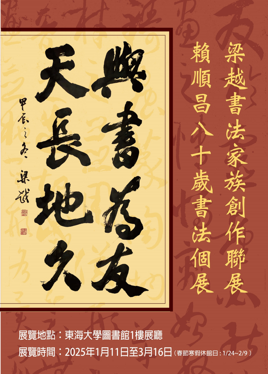 翰墨飄香,書韻傳情,邀您共赴一場書法盛宴!本次展覽以「與書為友、天長地久」為主題,展現書法藝術的深厚內涵與人文情懷。展覽特別呈現梁越書法家族的創作,以家族之名訴說書法傳承的情感紐帶;同時亦為賴順昌先生八十壽辰舉行個展,匯聚他畢生的書法精華,展現其縱橫古今的書藝風采。展覽融合傳統與創新,筆墨間蘊藏著無盡的智慧與生命力,邀您共賞一場書法藝術的視覺與精神饗宴。