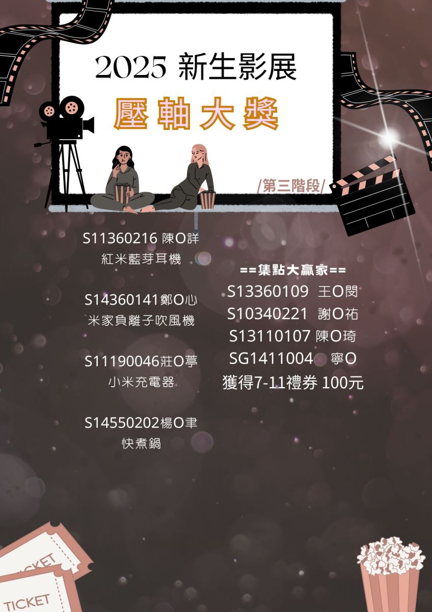 恭喜得獎同學,請於114年10月21日(二)晚間7點前至圖書館三樓多媒體室櫃台領取獎品,逾時獎品將不予保留