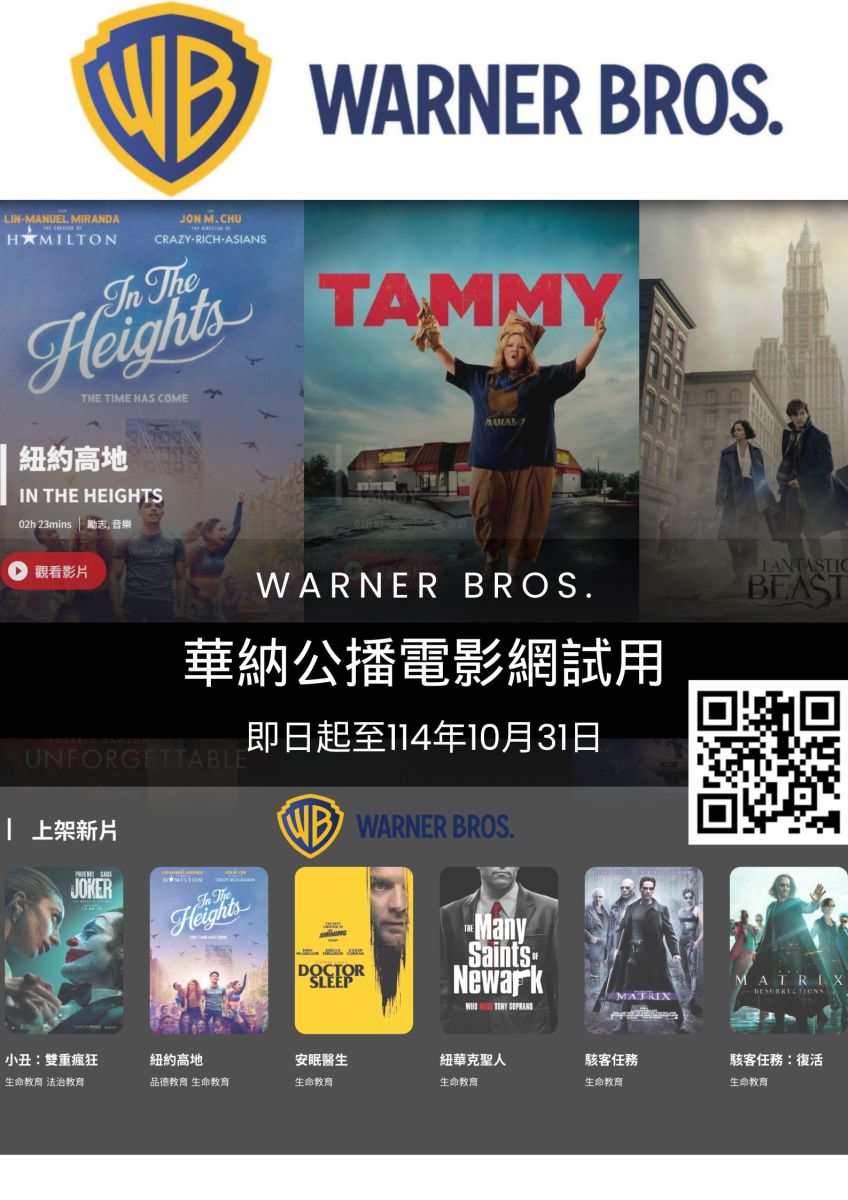 內容介紹: 隨心所欲欣賞強檔電影!「華納公播電影網」提供公播使用的影音串流平台,收錄華納兄弟Warner Bros.電影片商的最新電影與歷年經典與得獎影片。